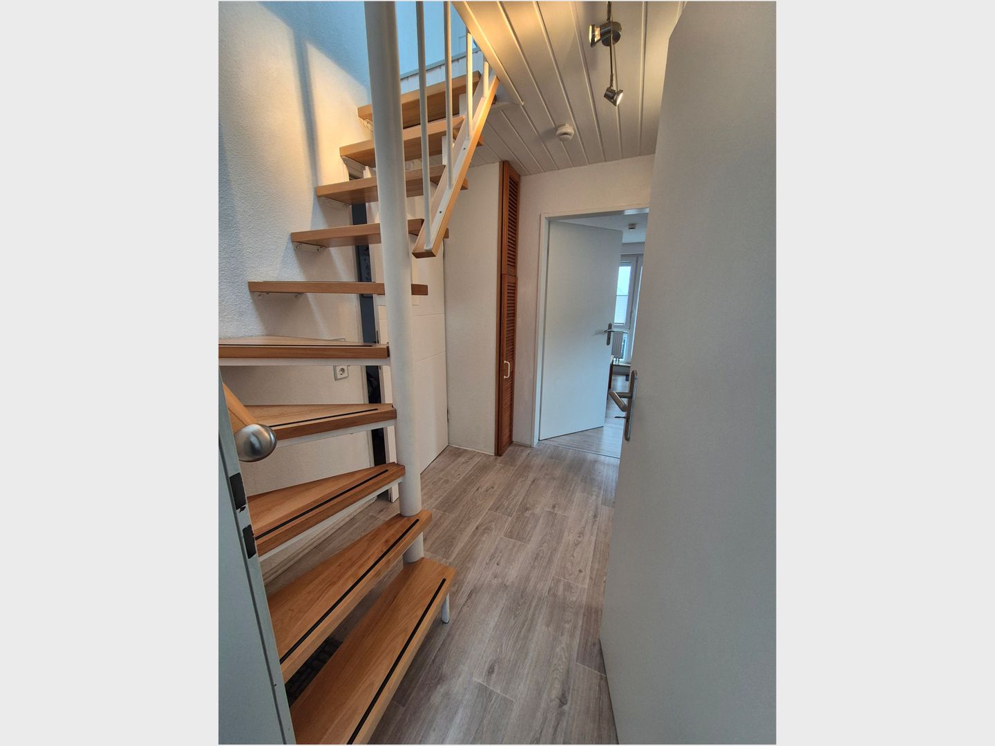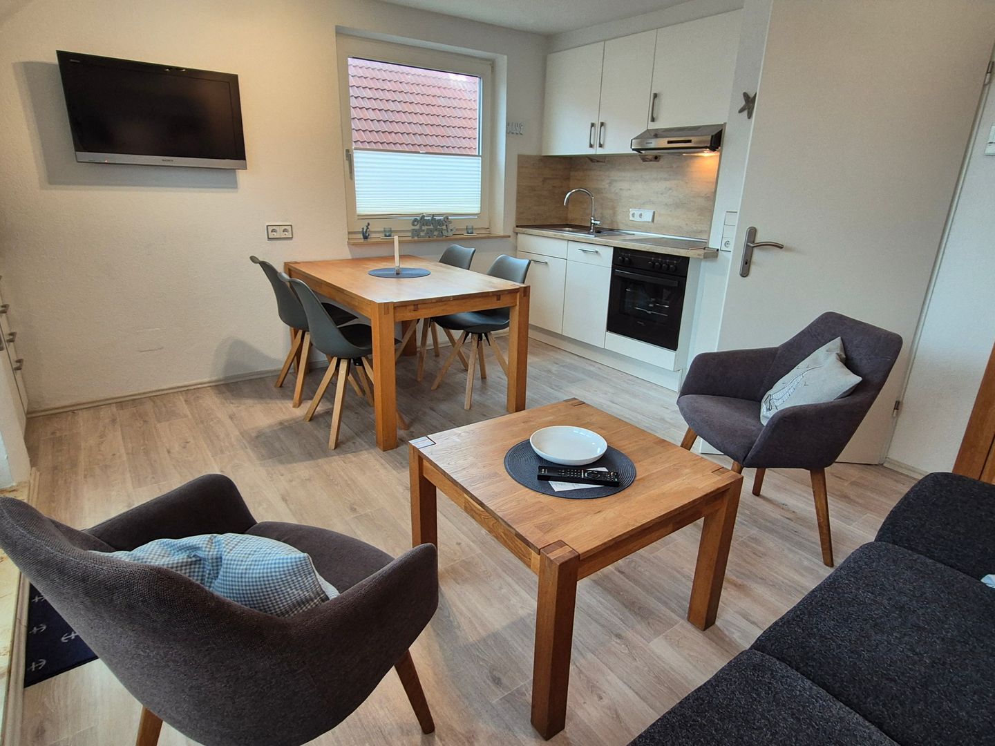 Im Inneren stehen Ihnen im 1 OG. ein kombinierter Wohn- und Essbereich mit toller Küchenzeile zur Verfügung; auch eine Diele, ein modernes Bad mit Dusche, sowie ein gemütliches Schlafzimmer. Ein weiteres Schlafzimmer finden Sie im ausgebauten Spitzboden, dieses erreichen Sie über eine offene Treppe.